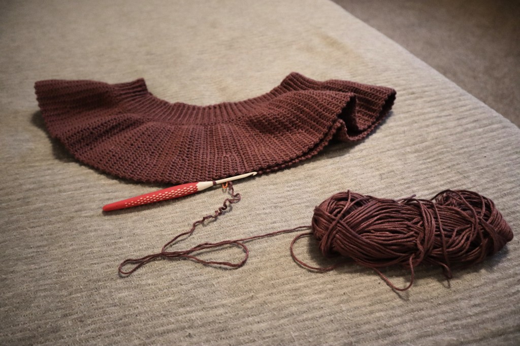 For the Wide Leg Shorts I’m using Truboo in Raisin. I’ve followed the waistband as written but switched up the stitch pattern for the main body of the shorts as I wanted a bit more of a denser fabric. I’ve done a *sc, ch2, sc* grouping per 2 stitches in the written pattern. Then on the next row it’s the same grouping that is worked into the ch2 space. Luckily with this yarn it still has a nice drape to it! I am a bit worried about not having enough yarn but we’ll see how it goes.